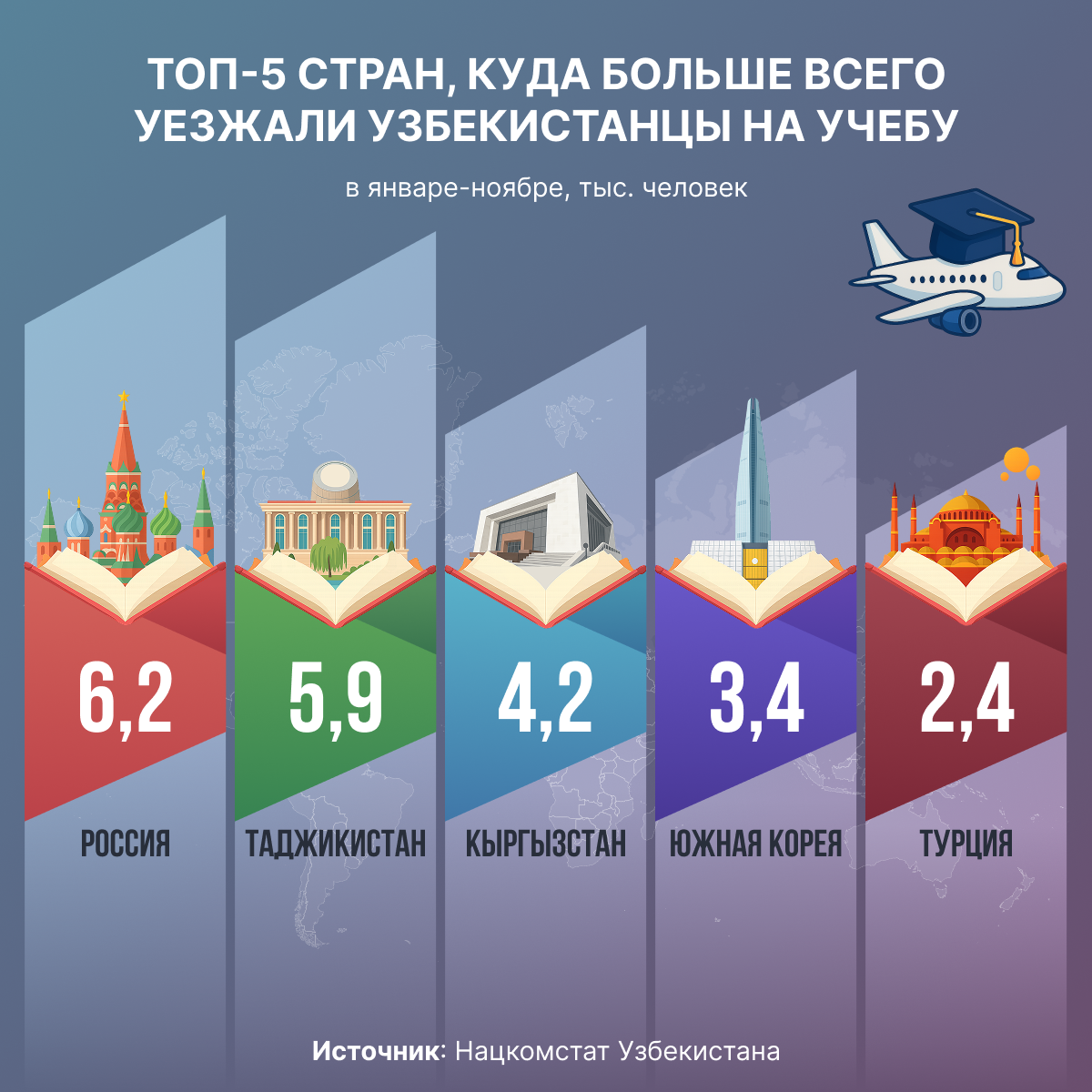 По данным Нацкомстата РУз, с января по ноябрь 2025 года 22,1 тысячи граждан Узбекистана выехали за границу с целью обучения. Чаще всего узбекистанцы уезжали в Россию. На втором месте находится Таджикистан, а на третьем месте расположился Кыргызстан.