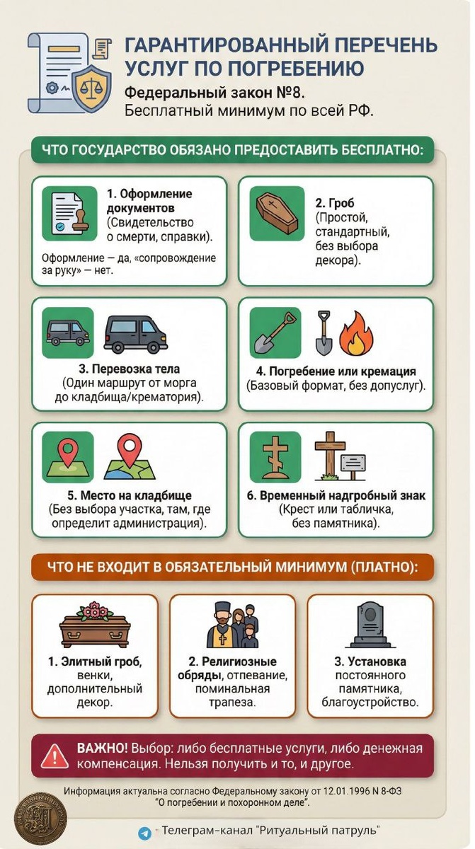 !❗️ 🧠 Важно! Гарантированный перечень — это про минимум. Про «похоронить достойно, но без излишеств». Главная проблема не в том, что платные услуги существуют. А в том, что момент перехода от бесплатного к платному почти никогда не проговаривается вслух. Как не перепутать платное и бесплатное на практике? Очень просто. Всё бесплатное — без выбора. Без пауз. Без «давайте получше». Как только появляется выбор, время, ожидание, слова «давайте сделаем по-человечески» - это уже не гарантированный перечень. И в этом нет ничего плохого - все по закону. Плохо только одно - когда об этом не говорят прямо. Один вопрос решает многое: «Это входит в перечень или это дополнительно?»