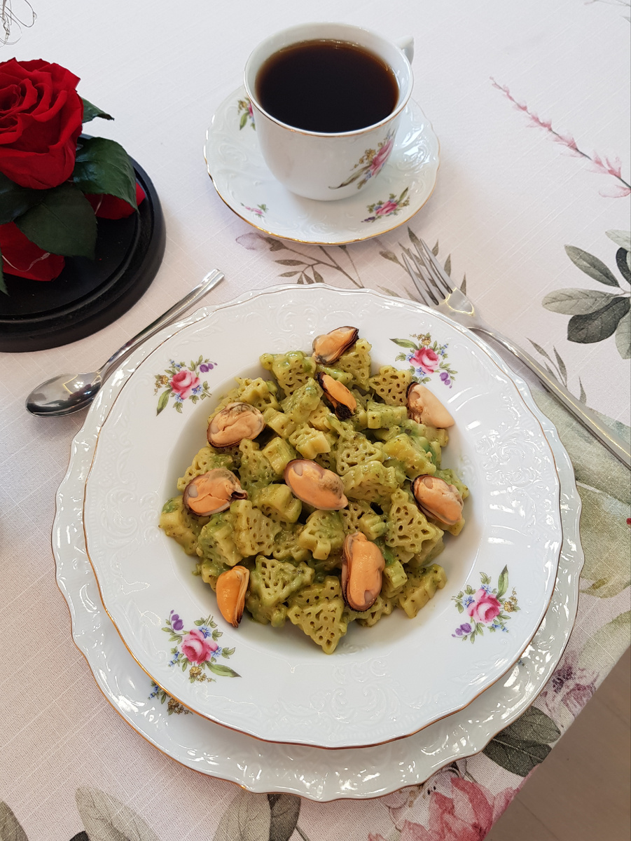 Добрый день, дорогие друзья! Сегодня я представляю вашему вниманию блюдо, которое порадует детей формой в виде ёлочек, а благодаря сочетанию соуса песто и мидий придется по душе многим взрослым. Для приготовления 5 порций нам понадобятся: 400 грамм макарон в форме ёлочек, 190 грамм соуса песто, 190 грамм сыра с базиликом, 190 грамм вареных мидий. Приготовление: в кипящую воду опускаем макароны, соль я не добавляю, так как соус песто и сыр достаточно соленые. Варим на среднем огне в течение 8 минут, не накрывая крышку. Сыр натираем на мелкой терке. С макарон сливаем воду, добавляем соус песто, перемешиваем. Добавляем натертый сыр, перемешиваем. Раскладываем по тарелкам, добавляем мидии. Приятного аппетита!