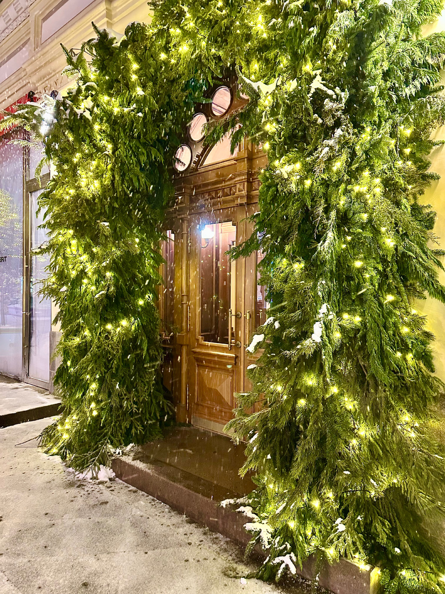 Над входом сияет воздушный декоративный фасад в пастельных оттенках — светлая, лёгкая конструкция с аккуратной лепниной, которая выглядит как кусочек рождественского десерта.