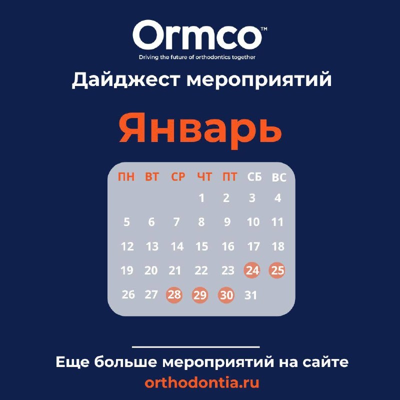 👏🏼 Вас ждёт: 📌 24-25.01.2026 —Ошибки и осложнения в ортодонтическом лечении. Как их избежать?, А.А. Симакова, Краснодар 📌 28.01.2026 — Вебинар. Вдумчивый выбор щечных трубок на моляры, М.С.Подвальников 📌 29-30.01.2026 — Полная диагностика дисфункций ВНЧС в ортодонтической практике. Модуль 1, Я.Ю.Дьячкова, Москва 📌 Онлайн курс. Торк брекета: как, когда, зачем?, Михаил Морозов 📌 Онлайн курс. Damon Ultima-революция в мире ортодонтии, Ангильери Матиас, Фрост Стюарт Еще больше полезных образовательных мероприятий Ormco и наших партнеров вы найдете на сайте orthodontia.ru 👈🏻