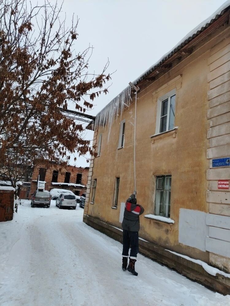 ⚠️ В Великих Луках проводятся работы по сбиванию сосулек для предотвращения опасности.