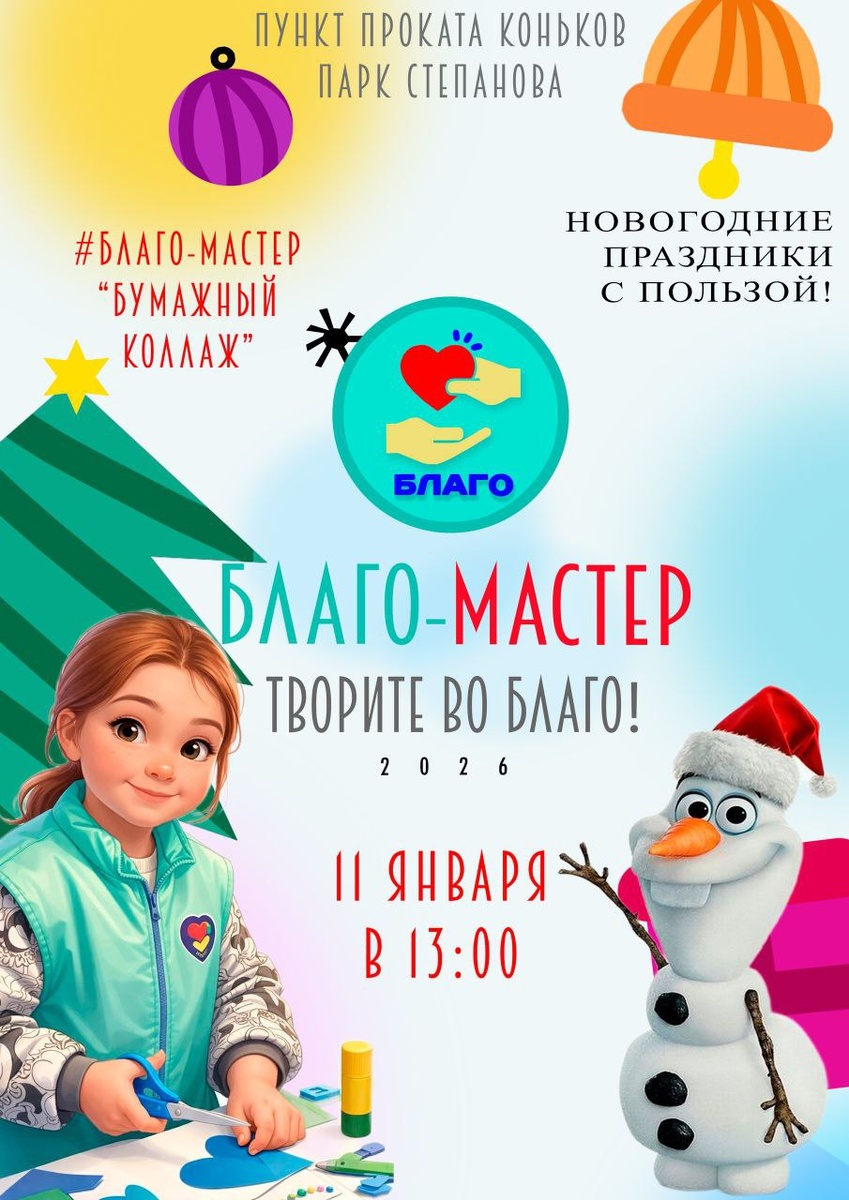 Друзья! Парк Степанова Приглашает всех на традиционный бесплатный мастер-класс в МБУК "Парк Степанова" 🔥 💖Погрузитесь в душевную атмосферу творчества, где каждый сможет создать свою уникальную работу и почувствовать радость созидания.💖 А еще вас ждет: 🎨Мастер-класс по созданию бумажных коллажей 🖼 Ярмарка добра: Приобретите уникальные ручные сувениры от добровольческой организации "Благо". Все вырученные средства идут на благотворительность! ⛄ Снежный гость: Ростовая фигура снеговика Олафа ждет всех для веселых фото и хорошего настроения! 🎀Дата: 11 января 🎀Время; 13:00 🎀Место: Пункт проката коньков, Парк Степанова Вход свободный! 📝Если вы хотите принять участие в мероприятии, отмечайтесь в опросе ниже!!!📝