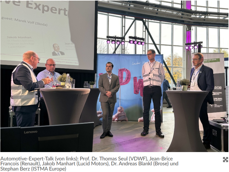 ). В следующей панели «Обсуждение автомобильных экспертов» приняли участие Андреас Бланкль (поставщик автокомпонентов Brose), Жан-Брис Франсуа (Renault), Джейкоб Мэнхарт (Lucid Motors) и профессор Томас Сеуль (VDWF), модератор — Стефан Берц. Главные предметы обсуждения: сжатые сроки запуска, интеграция разработки продукта и процесса, стратегическая кооперация и конкуренция с Китаем. «Участники согласились: производство оснастки должно поменять свою самопрезентацию. <...> Оснастка больше чем товар, потому что она вносит свой вклад в эффективность, качество конечного продукта, и сроки выхода на рынок. Жан-Брис Франсуа превосходно выразил это изменение восприятия: “хороший штамп приносит вам деньги — а плохой стоит вам денег”. Для того чтобы оставаться конкурентноспособными на международном уровне, производители оснастки должны быть вовлечены в разработку продукта на ранней стадии, работать тесно с департаментами продукта конкретного автопроизводителя, и быть способными управляться с бол