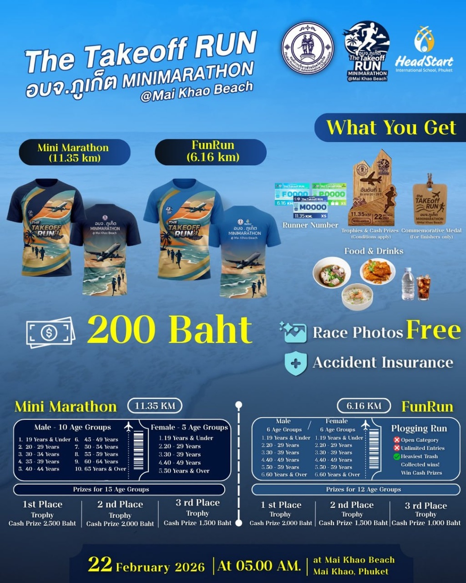 » Административная организация Пхукета (РРАО) продолжает регистрацию участников забега The Takeoff RUN, который будет проходить 22 февраля на пляже Май-Кхао. Именно на этом пляже находится 📍смотровая площадка, с которой туристы фотографируют взлетающие и садящиеся самолеты. И маршрут The Takeoff RUN будет проходить через эту точку. Атлетам и простым любителям бега предлагаются две дистанции – 11,35 км (мини-марафон) и 6,16 км (фан-ран). Регистрационный сбор в обоих случаях составляет всего 200 бат, при этом в набор участника входят памятная футболка и медаль. Победителей на обеих дистанциях ждут денежные призы и кубки. Также в программе заявлен так называемый Plogging Run с аналогичным сбором и комплекте участника. Организаторы объясняют, что речь идет о прогулке по пляжу (6,16 км) с одновременным сбором мусора, вынесенного морем на побережье. «Атлеты со всего мира и все любители бега – не пропустите! Уникальный забег по побережью через национальный парк под крыльями самолетов, во