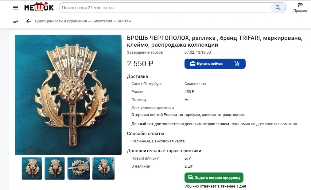 Эпизод 1 На продажу выставлена брошь. Название лота...странное - реплика, бренд TRIFARI, клеймо. Это что получается, компания Трифари изготавливала реплики, надо полагать, своих украшений, и маркировала их? О как! В описании продаца есть информация: "РОСКОШНАЯ БРОШЬ, ЧЕРТОПОЛОХ, РЕПЛИКА винтажной ФИРМЫ TRIFARI. МАРКИРОВАНА, есть клеймо. Австрийские кристаллы.Позолота. Редкая. РАЗМЕР 5,3×4 см". Смотрим внимательно. Оборот броши. Видим застежку, характерную для большинства брошей с известной азиатской площадки, и маркировку - TRIFART. Да, именно так! О маркировках украшений компании Trifari я уже писала в статье - "Ваша коллекция. История. Компания Трифари. Дизайнеры и особенности маркировки". Ссылка на нее есть внизу. И вот эта брошь в продаже на известной азиатской площадке. Размеры совпадают с размерами, указанными в описании российского продавца. И та же маркировка - TRIFART. Вот фото оборотов брошей с Али и продавца с МШ. Застежка и маркировка абсолютно совпадают. Вполне возможно,