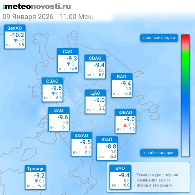 В 11:00 в Москве было от -10.5°C до -8.3°C, средняя температура -9.3°C #погода #Москва #зима #температура #9января #пятница