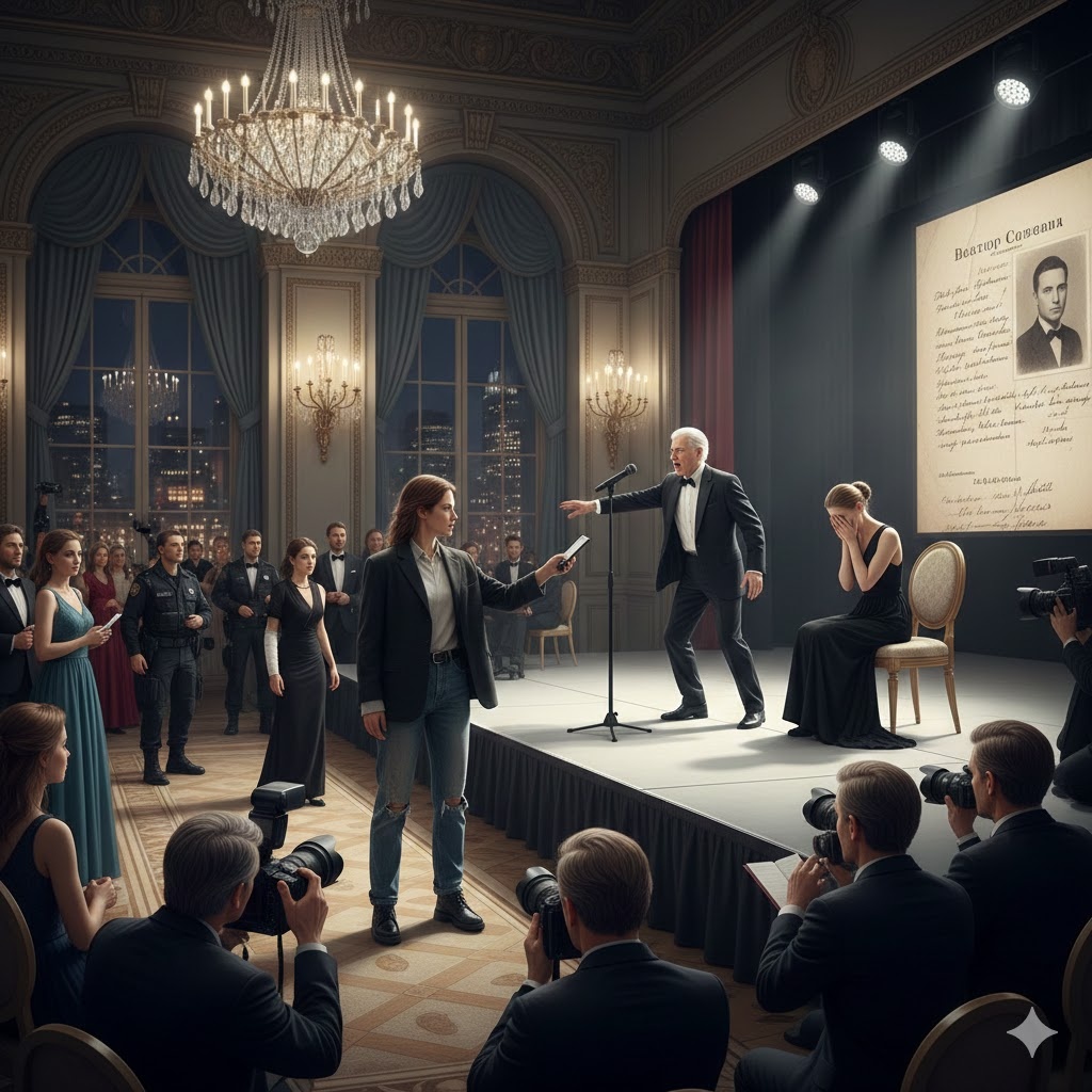 Зал замер. Журналисты, приглашенные на банкет, первыми вскинули камеры. Вспышки ослепляли Виктора, который метался по сцене, словно загнанный зверь.