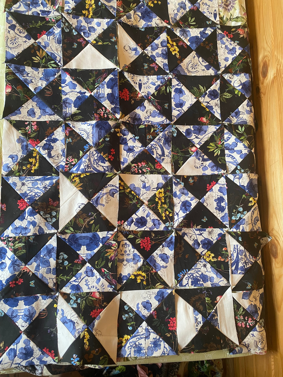 Каких-то пара дней и я уже нарезала три сотни треугольничков и даже сшила их в квадраты. Отутюжила и начинаю собирать конструктор. Это самое сложное…