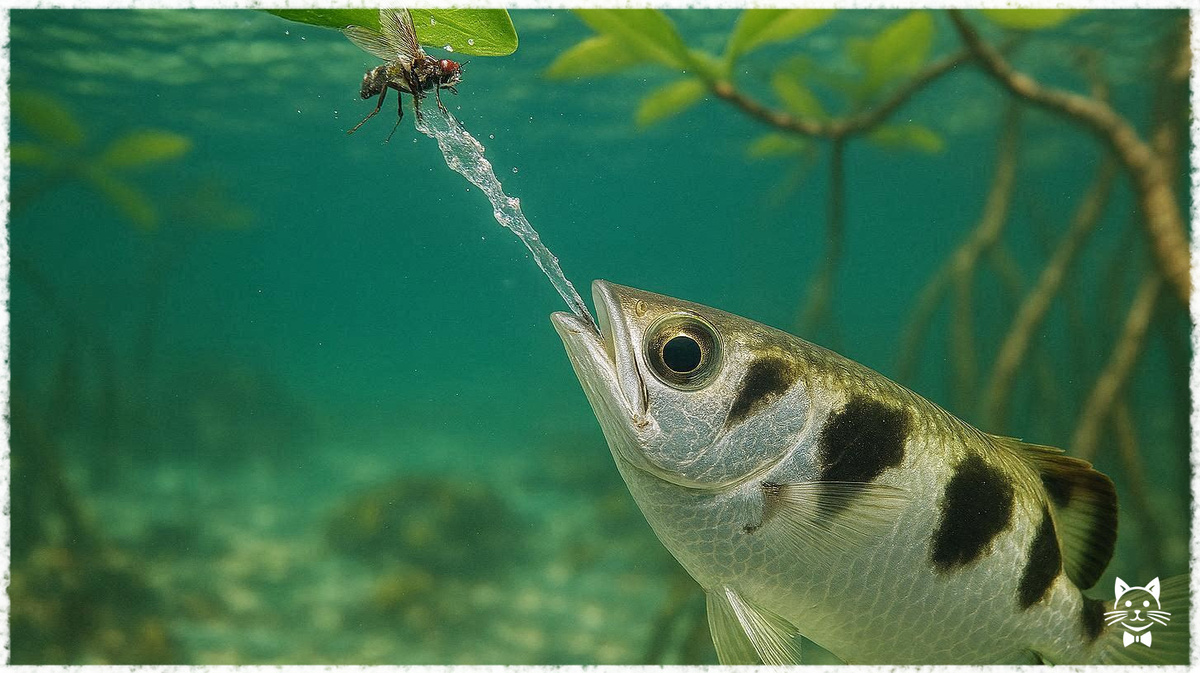 Один выстрел. Одно попадание. Муха падает в воду, я её ем. Звучит просто? Теперь добавьте, что муха находится в воздухе, я под водой, и из-за преломления света она не там, где я её вижу. Всё ещё просто? Тогда позвольте представиться. Я рыба-лучник, он же брызгун, природный гидродинамический калькулятор и непревзойдённый подводный стрелок. Мой мир, это мангровые заросли и тихие воды Юго-Восточной Азии. А моя работа, решать в уме оптические задачи, над которыми люди ломают голову на уроках физики, и сбивать струёй воды насекомых с веток. Без промаха. Вы смотрите на ветку над водой и видите муху именно там, где она сидит. Я смотрю снизу и вижу её в другом месте. Мой взгляд искажается на границе двух стихий, воды и воздуха. Из-за этого преломления цель может смещаться примерно на 25 градусов от её реального положения. Для большинства ваших собратьев это была бы неразрешимая проблема. Для меня рутинный расчёт. Мой мозг, даже не имея коры, как у вас, мгновенно вносит поправку. Я не вижу мир