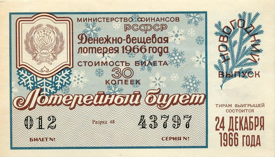 В СССР проводились денежно-вещевые лотереи - розыгрыши, в которых разыгрывались не только деньги, но и вещи. Цель - привлечение финансов на нужды государства, например, на военные нужды во время Великой Отечественной войны. Выигрышем в лотерее могли быть не только деньги, но и дефицитные товары. Позднее, с 1950-х годов и до распада СССР лотереи проводились на регулярной основе. Сегодня мы посмотрим, как выглядел лотерейный билет новогоднего выпуска денежно-вещевой лотереи 1966 года. Данный лотерейный билет из коллекции тульского краеведа Владимира Щербакова. Помню хорошо такие лотереи и билеты. Иной раз их покупал мой "дед" (он был отчимом маме, но я его называл дед). Правда выигрыша у него особого не было, тем более серьезного. Вспоминаю в прессе таблицы с выигрышными билетами и как надеялся, что в этот раз повезет, но... увы. Видел их и в продаже, например, на почте. А еще под занавес существования СССР, в Туле, в 1991 году распространяли подобную лотерею для школьников, нам тогда в