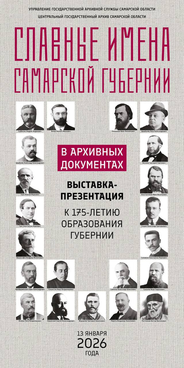 13 января 2026 года, в День Самарской губернии, в 14.00 в выставочном зале Центрального государственного архива Самарской области (г. Самара, ул. Мичурина, 58, 3 этаж) состоится торжественное открытие выставки «Славные имена Самарской губернии в архивных документах» и презентация историко-документального альбома, подготовленного самарскими архивистами к 175-летию образования губернии. За прошедшее время Самарский край получил развитие как крупный промышленный, сельскохозяйственный, научный, образовательный, медицинский и культурный центр. Все эти преобразования стали возможны благодаря усилиям его жителей. Менялись решаемые задачи, и каждое время рождало свои имена. Губернский период – особый в истории развития Самарского края, время формирования её социальных и культурных институтов, профессиональных сообществ и традиций. В основе экспозиции – документы из фондов губернского правления, канцелярии губернатора, городской думы, городской управы, университета и архивного бюро, а также лич