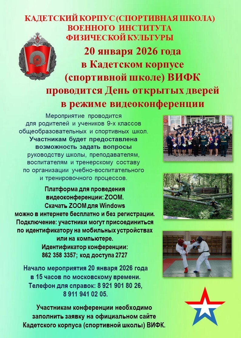 ✨ Кадетский корпус военного института физической культуры проводит день открытых дверей 20 января 2026 г. в режиме видеоконференции!