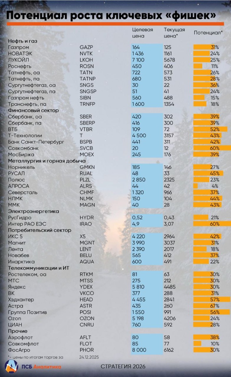 » Основные прогнозы и идеи от ПСБ Аналитики - коротко и по делу. 🏛 МАКРОЭКОНОМИКА ▪️ВВП России: рост на 1,7% в 2026 году, ускорение со второго полугодия. ▪️Инфляция: стабилизация около 5% (таргет 4% не будет достигнут). ▪️Ключевая ставка ЦБ: снижение до 12% к концу года. ▪️Курс рубля: умеренное ослабление — 90 ₽/$ и 12,7 ₽/юань к декабрю 2026. ▪️Бюджет: дефицит около 3% ВВП, доля нефтегазовых доходов снизится до 18,5%. 📊 ФОНДОВЫЙ РЫНОК Облигации (ожидается рост) 🔹Доходность 10-летних ОФЗ упадет до ~11%. 🔹Целевой уровень индекса RGBI: 138–140 пунктов. 🔹Структура портфеля на 2026: ▪️55% — облигации с фиксированным купоном (ОФЗ, корпоративные АА–А) ▪️25% — флоатеры (до 3 лет) ▪️20% — валютные облигации (до 3 лет, USD/CNY/EUR) Акции (оптимистичный прогноз) 🔹Индекс МосБиржи достигнет 3800 пунктов (базовый сценарий). 🔹В позитивном сценарии — до 4200 пунктов. 🔹Рост поддержат: снижение ставки, ослабление рубля, улучшение геополитики. 🔹Начало года: дефицит идей, высокая волатильн
