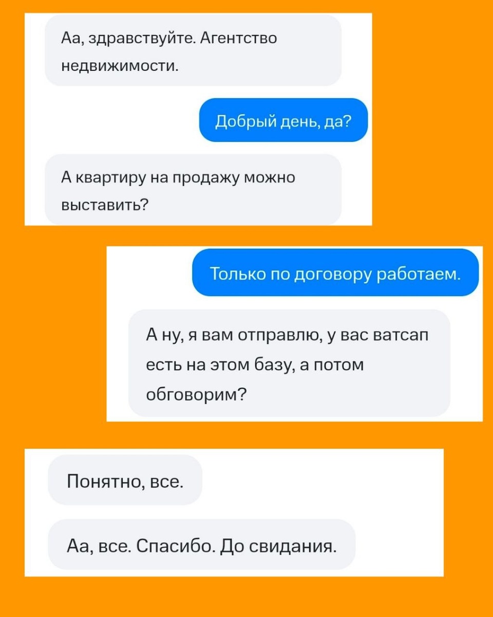 ?» Второй день подряд звонит один и тот же номер. Вчера — не взяла. Сегодня — взяла. — А квартиру на продажу можно выставить? — Нет. — А если я вам в WhatsApp отправлю, у вас база есть, а потом обсудим? — Нет. Только по договору и с предоплатой. На этом разговор закончился. Вся коммуникация заняла 28 секунд. Выставить квартиру «просто так» — не получилось. Работа начинается с договора и предоплаты. Всё остальное — не работа. 📩 По вопросам начала работы — @LBilan #услуги@Bilan_pro #вторичка@Bilan_pro #продавцу@Bilan_pro 📲 Подписаться на канал 💙 Поддержать канал бустом