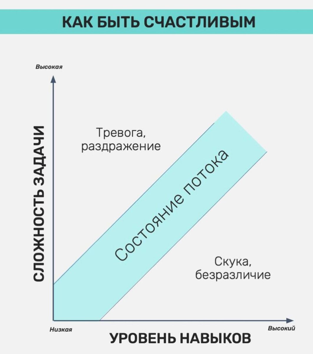 ? В 2015 у меня был один из самых жёстких кризисов в жизни. И, как ни странно, я за него благодарен. Потому что именно тогда мне в руки попалась книга, которая так сильно повлияла на меня, и о которой я часто потом всем рассказывал. Это был «Поток» Михайи Чиксентмихайи. Из большого количества полезных инструментов в ней я взял всего один. Но зато идеально встроил его в жизнь. И именно этот инструмент поддерживает во мне перманентное состояние счастья и потока, благодаря которому я чувствую страсть к жизни, к работе, к своему делу, к новым задачам и вызовам. Теперь я умею быть счастливым. И даже находясь здесь - я умею это делать и управлять этим. Что же это за инструмент, который меняет все? 🤔 Сейчас расскажу. Если ты когда-то ловил то ощущение, когда время исчезает, ты весь в задаче, всё получается, ты как будто танцуешь с жизнью — то вот, ты был в потоке. 🌊 И это не магия. Это физиология. 🧠 Когда ты делаешь то, что тебе по плечу, но чуть выше обычного уровня — мозг начинает вы