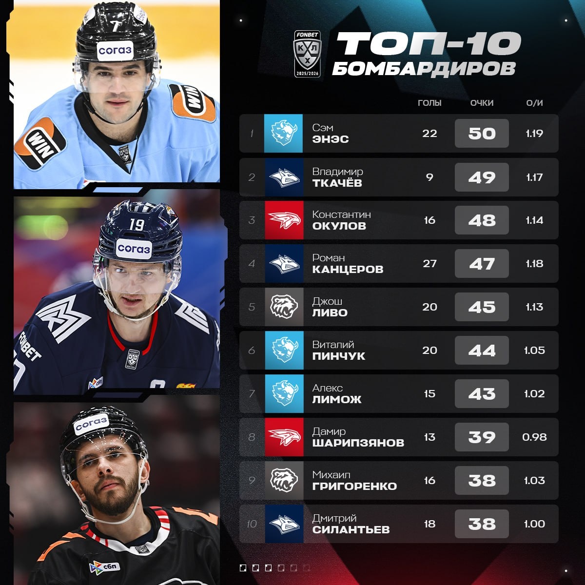 🦬 Сэм Энэс набрал 50 очков и возглавил гонку бомбардиров.