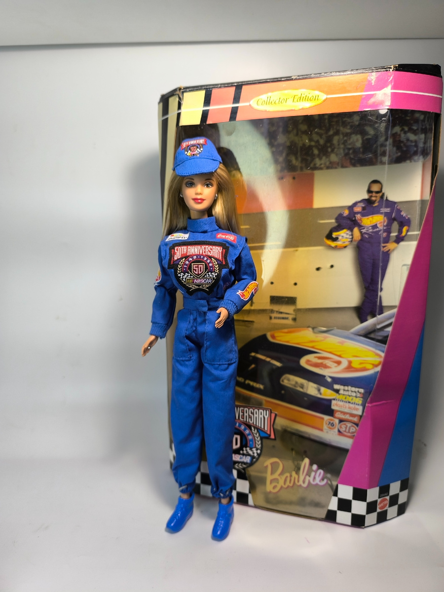 Кукла одета в гоночный комбинезон. Детализация отличная. Комбинезон синего цвета. На комбинезоне есть различные нашивки. Головной убор куклы выполнен в виде кепки с логотипом пятидесятилетия гонок NASCAR.