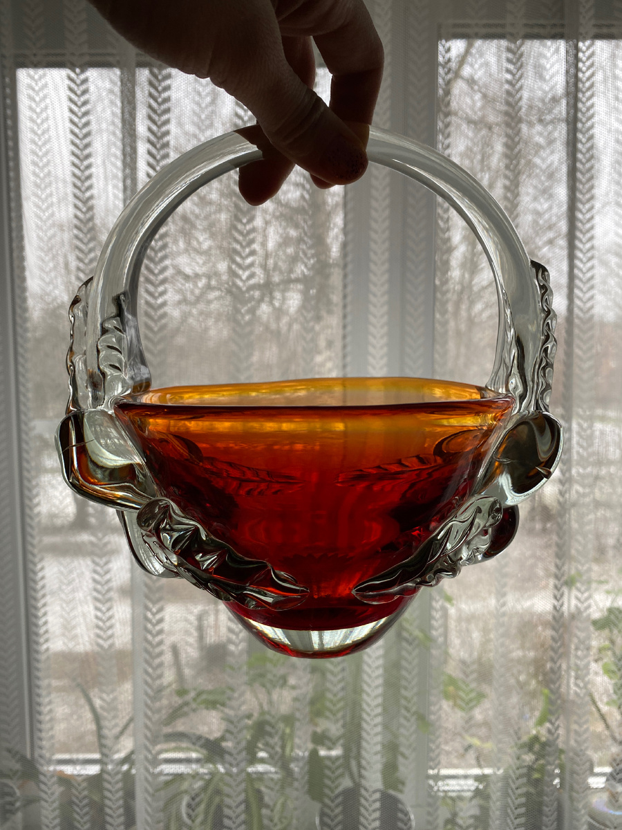 Заметьте, ручка и листья и плоды выполнены из прозрачного стекла, а чаша - из цветного. Не могу сказать, визуальный ли это эффект или умышленно созданное растекание цвета, но вижу градиент - от медово-янтарного сверху до густого карминового у основания.