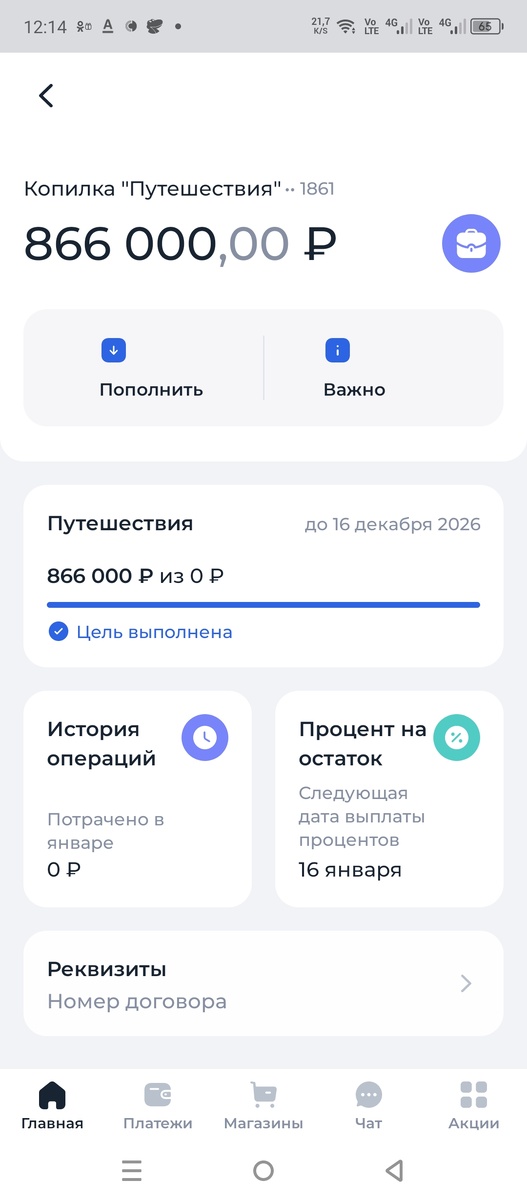 Если верить договору проценты начисляются на ежедневный остаток, первые три месяца под 17% годовых. Завтра исполнится один месяц и посмотрю что и как. Осенью у меня был подобный счёт в Яндексе и там начисление процентов было видно сразу. В лучшие времена плюс 300 рублей каждый день. Очень наглядно 😁. Сейчас основная часть копилки банковские средства, на погашение уйдёт 744 455 рублей. Всё что выше моё)). К сожалению, лазеек попользоватся кредитными деньгами и не платить за это стаёт всё меньше. И не такие уж большие деньги мне набежали за квартал, а именно 16 800 руб. С другой стороны для получения этого дохода постучал в течение получаса по клавишам смартфона и немного поволновался😂 ближе к закрытию.