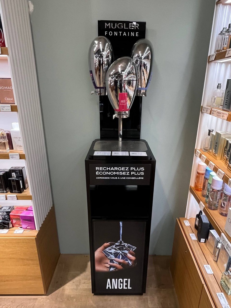 "Если клиент уже купил флакон наших духов, то второй раз тару уже покупать не надо", - решили во французском бренде Мюглер и придумали для своих популярных духов Ангел вот такую станцию по продаже на розлив. Можно выбрать объем флакона и один из трех видов духов и налить во флакон, который остался с прошлого раза. Марка духов достаточно популярная и при правильном разъяснении и отсутствием необходимости каждый раз платить за флакон пользуется спросом :) Получилось буквально один флакон на долгие годы :)