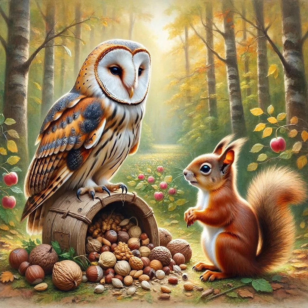 В лесу, где у каждого дерева был свой шёпот, жила Белка. Она собирала орехи, но не те, что были сладкими для неё, а те, что хвалили другие. «Собирай только лесные! — говорил Мудрый Филин. — В них мудрость!». «Нет, только кедровые! — настаивал Бурундук. — Это элитный запас!».