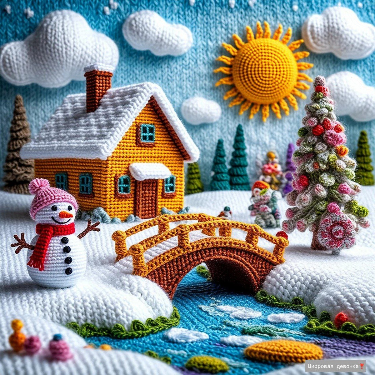 😊 Промт: сказочная связанная деревня, вязаный снеговик стоит рядом с вязаным домиком в деревне, течёт связанная речка, через неё перекинут деревянный вязаный мостик, светит вязаное солнышко и рядом вязаные белые облака, цвета светлые и яркие