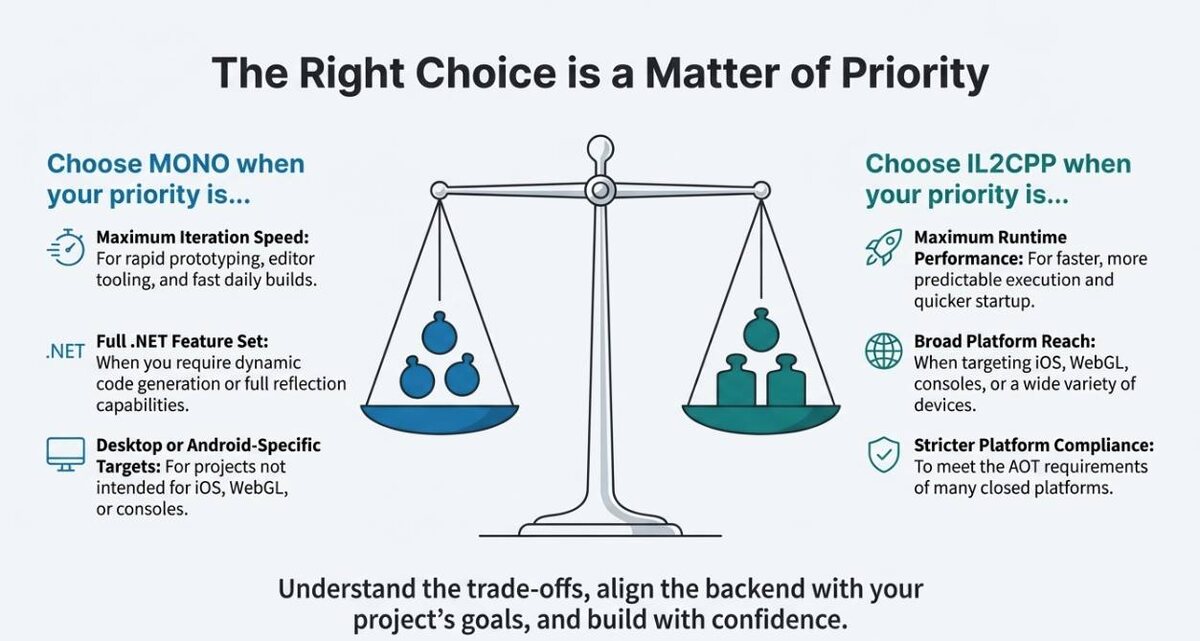 Что нужно знать? https://researchandprogram.blogspot.com/2026/01/il2cpp-vs-mono-scripting-backend.html Базовый ответ. Да ничего не надо знать о нюансах этих двух скриптинг бекендов. Статья обзорная и забавная, с симпатичными картинками. Если вы не в курсе что такое AOT и JIT — можно пролистать. И я согласен с автором, если вы хотите говорить про настоящую производительность, юзайте бурст :) Для релизов используют IL2CPP, а для тестов моно :) Рассказ окончен :) Рендер разрабам до фонаря какой там скриптинг бекенд, разрабам бизнес логики это редкий проект, где вопросы производительности будут упираться в выбранный скриптинг бекенд. Эту область работы Юнити можно оставить загадочным черным ящиком и не потерять вообще ничего. #новости