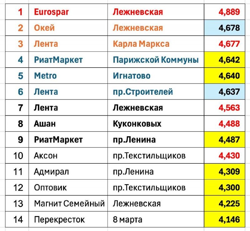 : Google, Яндекс, 2GIS (На желтом фоне - у магазинов от 2 до 5 тысяч оценок; на синем - от 5 до 8 тысяч, красным шрифтом - более 8 тысяч оценок) А какому ивановскому гипермаркету отдаете предпочтение вы?
