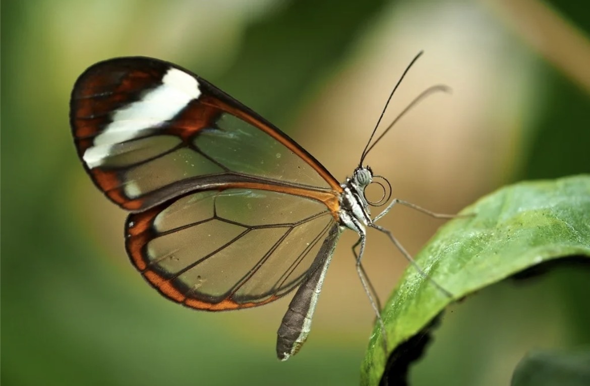 С первого взгляда кажется, что у этой бабочки просто отсутствует большая часть крыльев. Между темными прожилками простираются обширные прозрачные «окна». Это не отсутствие чешуек, а их уникальная адаптация. Чешуйки на этих участках лишены пигмента и имеют наноструктуру — микроскопические столбики, расположенные в хаотичном порядке.