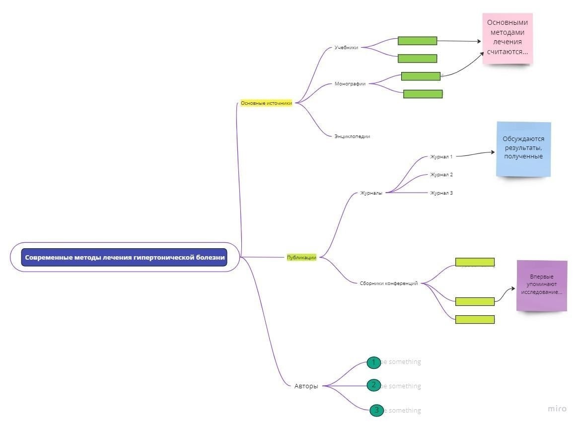 Mind maps — это изящный способ навести порядок в хаосе, генерировать и связать идеи. Например, с центральной темой можно связать основные базовые источники. Работы, на которые они ссылаются, имеют похожий дизайн или приходят к общим выводам можно объединять в группы. Добавьте на интеллект-карту нужные цитаты, библиографические данные, URL-адреса или критические заметки. Объединяя источники в группы и выстраивая последовательности, вы создаете логическую схему будущего обзора. Кроме того, электронные сервисы позволяют сразу фиксировать все нужные цитаты и ссылки на одной карте, чтобы потом их можно было быстро найти. Интеллект-карты работают как помощник для учёного, так как: — Быстро фиксирует идеи и связи: центральный вопрос — ветви — подветви (источники, методы, выводы). — Поддерживают весь цикл: от мозгового штурма и обзора литературы до организации исследования и написания текста. — Масштабируются без ограничений: добавляйте заметки, файлы, ссылки, цветовые метки; связывайте пе