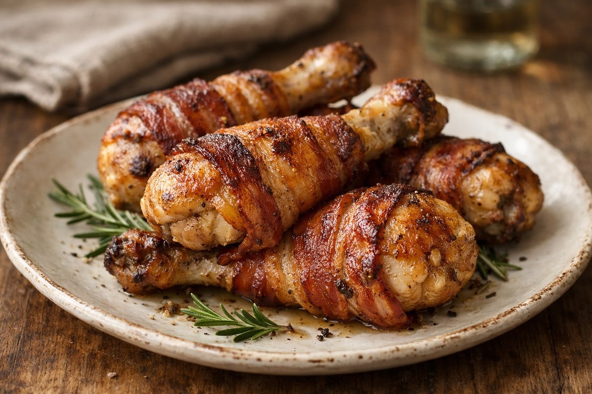 Кожу аккуратно расправить. Каждую ножку обернуть ломтиками бекона внахлёст.