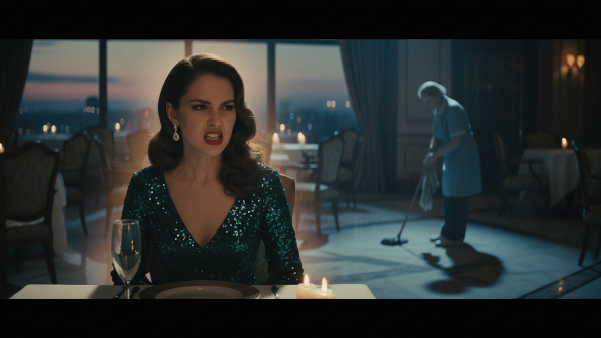 Молодой паренек подбежал, извиняясь, и наполнил бокал. Анжела фыркнула. Настроение было испорчено. Взгляд её упал на пожилую женщину в синей униформе уборщицы, которая тихонько протирала пол в дальнем углу зала. Женщина была старенькой, с узловатыми руками и добрым, усталым лицом. Она старалась быть незаметной, двигаясь плавно, чтобы никому не помешать.