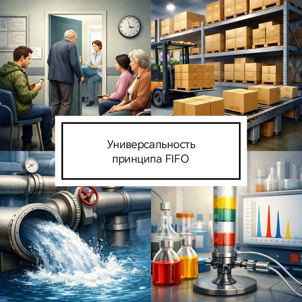 Да, именно обычного складского принципа First In - First Out, То есть если мы что-то положили на склад, то потом забираем то, что положили первым, а не последним. В производстве это позволяет избежать лежалого товара и создает надежную прослеживамгсть каждой партии. В жизни люди не всегда руководствуются этим принципом, именно поэтому у 60% (статистика из вики) европейцев в глубине холодильника постоянно что-то портится и они это выкидывают. Еще без FIFO можно на несколько лет забыть в глубине шкафа купленную одежду или... пролезть, к всеобщему неудовольствию, без очереди в поликлинике. Очередь ведь это тоже FIFO. Я очень удивлен, что этот принцип не вынесен в принципы диалектики, наряду с универсальным "перехода количества в качество". Многие жизненные задачи сильно выиграют, если привносить в них FIFO. С точки зрения химии, такие процессы как хроматография или, скажем, классическое титрование, не работают без этого принципа. В хроматографии продольное перемешивание элюента ведет