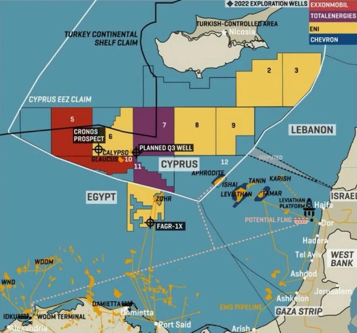 природного газа у берегов Кипра. Кронос — одно из трех месторождений природного газа, обнаруженных Eni и TotalEnergies в Блоке 6 исключительной экономической зоны Кипра. По оценкам, запасы углеводородов в нем составляют 3,4 триллиона кубических футов. Предполагается, что газ с месторождения Кронос можно будет транспортировать по трубопроводу на перерабатывающий завод в египетском городе Дамиетта, используя уже существующую инфраструктуру египетского месторождения Зор, расположенного примерно в 80 километра Да, турки как-то тихо себя вести стали в этом районе и претензий не предъявляют.