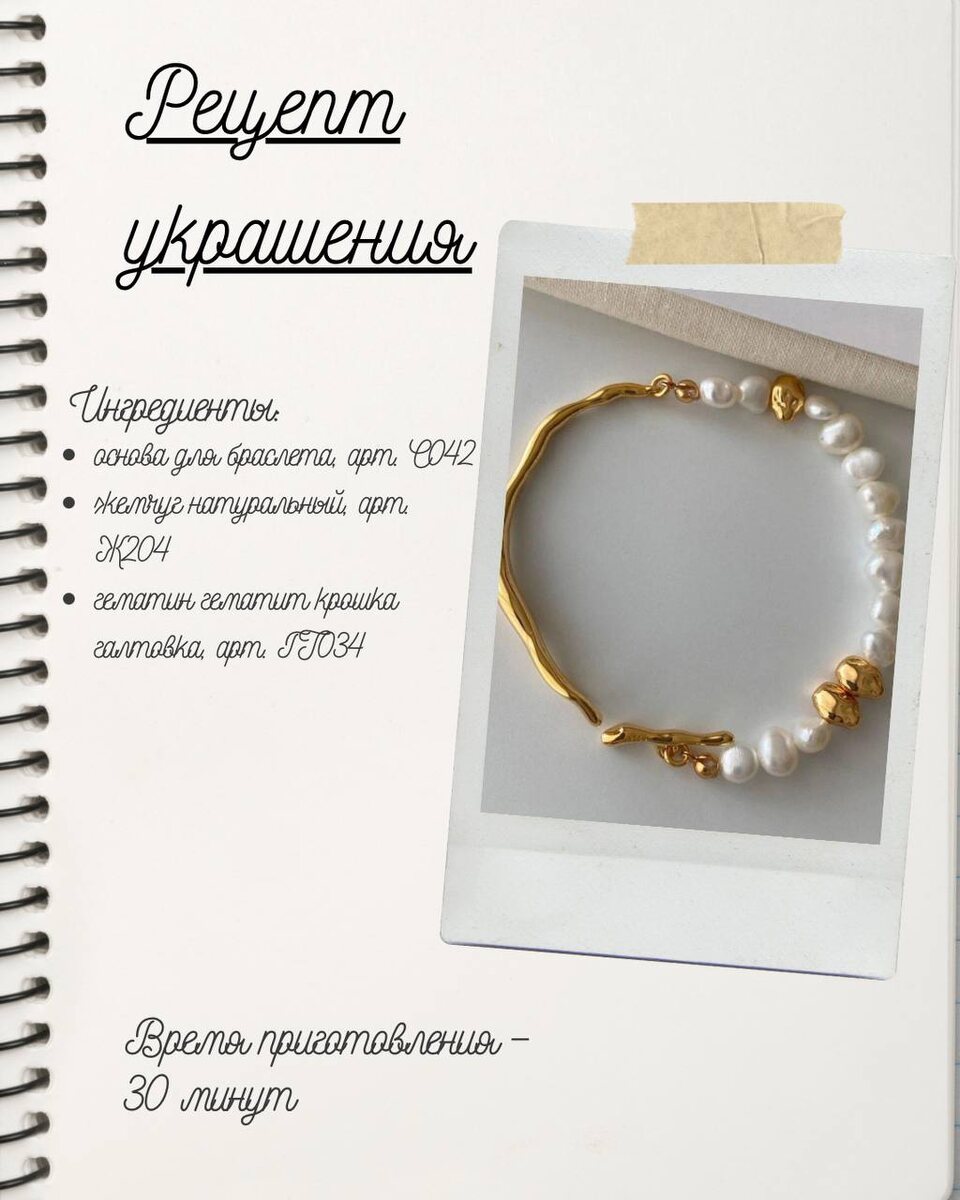 Продолжаем нашу рубрику и первым украшением в новом году соберем браслет с жемчугом и лёгкой перчинкой. Спокойный, нежный, но не скучный - как раз тот случай, когда украшение хочется носить каждый день ✨ Основные ингредиенты - Основа для браслета, арт. С042 - Жемчуг натуральный, арт. Ж204 - Гематин гематит крошка галтовка, арт. ГТ034 Расходники - Ювелирный тросик, арт. ТР02 - Кримпы зажимные, арт. М610 - Каллоты, арт. М604 - Соединительные колечки, арт. М314 Рецепт: Берём ювелирный тросик и нанизываем жемчуг, а для акцента добавляем несколько бусин гематита - совсем чуть-чуть, чтобы появился характер. С обеих сторон фиксируем тросик с помощью кримпов и каллотов. Дальше соединяем заготовку с основой браслета через соединительные колечки. Готово 💫