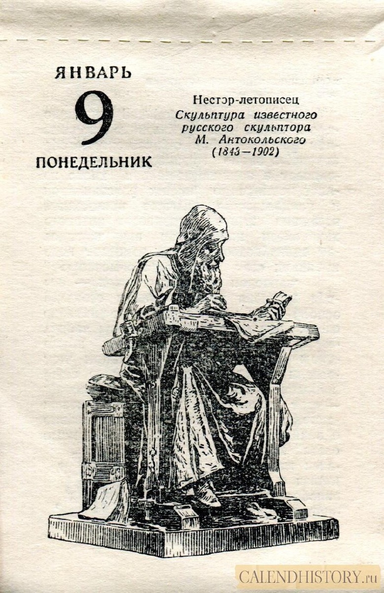 9 января 1956-го года — Календарь школьника Нестор-летописец Скульптура известного русского скульптора М. Антокольского (1843-1902) Больше старых советских отрывных календарей смотрите у нас на сайте - calendhistory.ru https://calendhistory.ru/9-janvarja-1956-go-goda-kalendar-shkolnika/