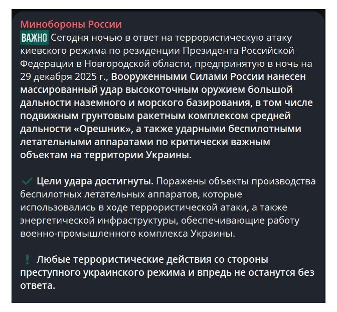 п. Перед кем мы оправдываемся? Кому и что мы должны объяснять? Если есть какие-то договорённости с американцами в рамках взаимного контроля применения стратегического вооружения, то было бы круто, если бы это кто-то объяснил. А то удар Орешником выглядит убедительно и ярко, а заявление МО об этом, как оправдание и слабость. "Неофициальный Безсонов" Сальное Дифлопэ