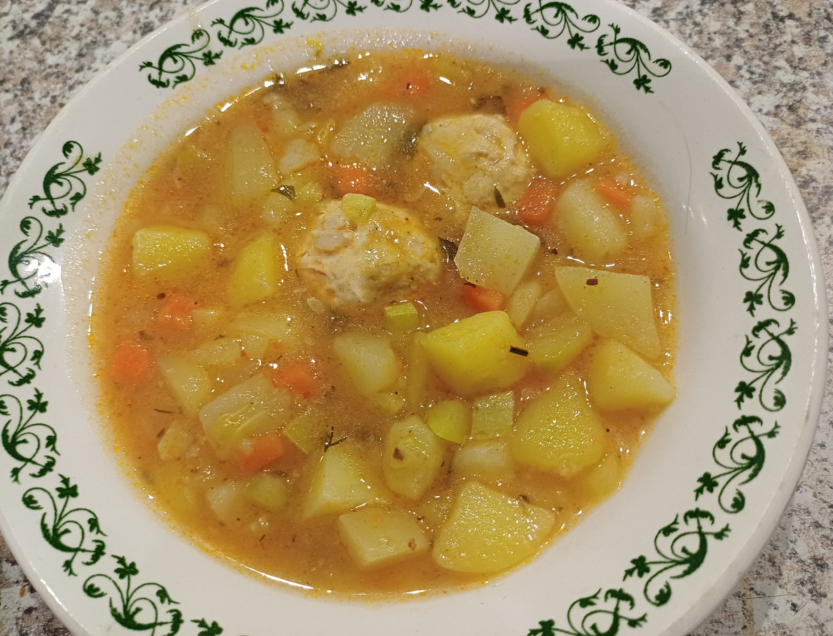 В фарш добавить соль,черный молотый перец, хорошо вымесить и сформировать маленькие тефтельки. Нарезать кубиками лук,морковь,кабачок и картофель.Обжарить в небольшом количестве растительного масла лук и морковь примерно 5 минут. В миску налить воду добавить томатную пасту,прованские или итальянские травы,соль,перец,копченую паприку,хорошо перемешать и вылить в