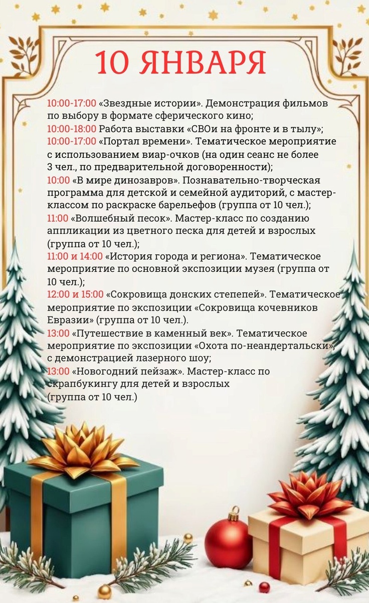 : • посетить новые выставки - «СВОи: на фронте и в тылу» и «Антагонисты. История белого и черного цветов»; • стать участниками мастер классов «Волшебный песок» и «Новогодний пейзаж»; • изучить сокровища сарматов и почувствовать атмосферу древнего Азака; 🫠 Детские мероприятия Ростов-на-Дону. Я местный! 📱 Мероприятия Ростов-на-Дону. Я местный! в MAX