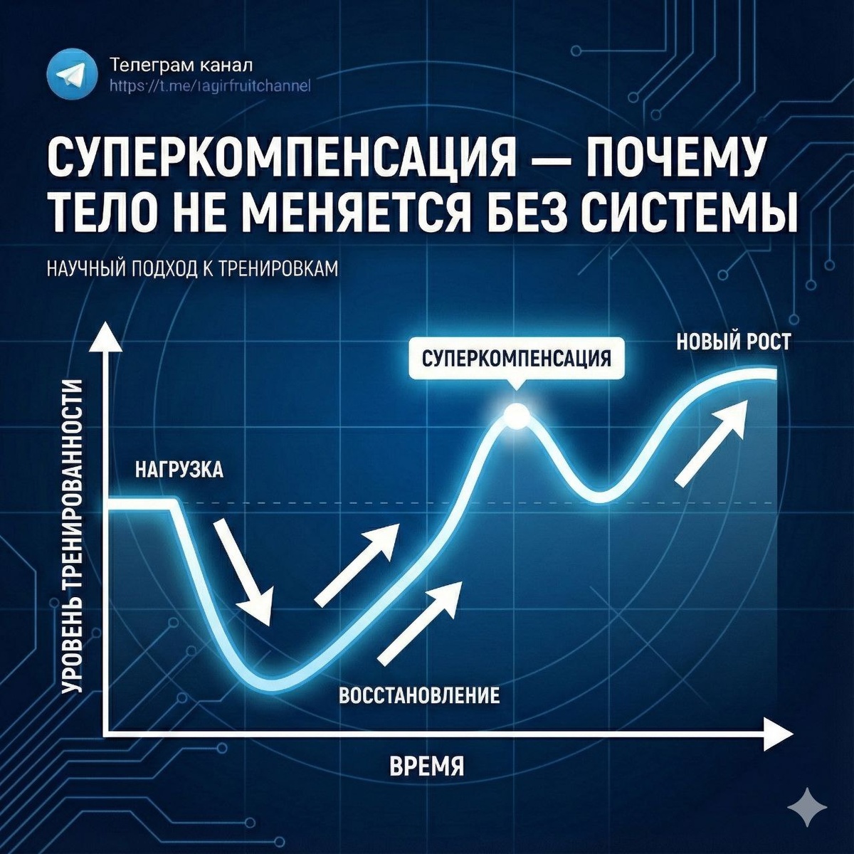 ” 💬 Есть одна простая вещь, которую многие в зале не понимают: тело не становится сильнее на тренировке. Становится — между ними 🧠 Этот момент называется суперкомпенсацией — когда организм восстанавливается чуть выше, чем был, чтобы в следующий раз справиться легче. Но есть две ловушки: 1. Слишком редко — прогресса нет. Дал нагрузку → подождал неделю → суперкомпенсация прошла → ты снова в нуле. 2. Слишком часто — тоже нет. Бьёшь по одной зоне без отдыха → тело пытается только выжить, а не расти. Вот почему многие говорят: “Хожу в зал, а тело стоит”. Потому что нет системы, а не силы воли. Оптимальная схема: 👉 нагрузка 👉 восстановление 👉 суперкомпенсация 👉 новая нагрузка (чуть сильнее) Не раньше. Не позже. Это физиология, а не мотивация ⚙️ Если хочешь, чтобы тренировки наконец работали — нужна структура, а не случайные усилия. Я уже собрал такую систему под твои данные. Хочешь тренироваться с умом — заходи в @tagirfruit_bot. Не забудь поделиться ссылкой на мой канал :)