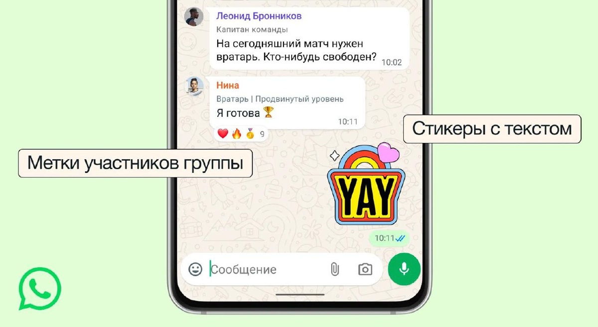 1. Метки участников. У каждого из нас свои обязанности, и иногда хочется добавить этому больше контекста в групповом чате. Теперь вы можете выбрать метку, которая показывает вашу роль в группе. Для каждой группы можно выбрать свою метку. Так что в одной группе вы можете быть «папой Анны», а в другой — "вратарем". 2. Текстовые стикеры. Чтобы сообщения действительно бросались в глаза, теперь можно сделать стикер из любого слова — просто введите его в строке поиска стикеров. Вы также можете добавлять новые стикеры прямо в пакеты стикеров, не отправляя их в чат. 3. Напоминания о мероприятиях. Теперь при создании и отправке мероприятия в групповом чате вы можете настроить пользовательские напоминания для приглашенных. Так никто не забудет приехать на вечеринку, которую вы устраиваете, или вовремя подключиться к звонку. Подробнее: https://blog.whatsapp.com/level-up-your-whatsapp-group-chats-with-new-member-tags-text-stickers-and-more