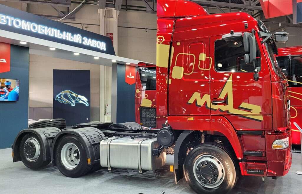 Седельный тягач с задней подъемной осью и колесной формулой 6х2. Первая подобная модель, которую Минский автозавод ставит в серию. Наличие подъемной оси, или «ленивца», значительно облегчает эксплуатацию машины. При обычном движении задний мост находится в рабочем положении, распределяя вес равномерно между осями. При преодолении труднопроходимых участков (снег, крутые склоны) водитель может поднять третью ось, увеличив давление на ведущие колеса и повышая проходимость. Кстати, у этого тягача задняя ось российского производства. Делают ее на заводе «Ростар». На тягаче установлена рестайлинговая кабина, как и у грузовиков юбилейной серии. Плюс автомобиль получил расширенное базовое оснащение, в которое входят полный электропакет, кондиционер, система курсовой устойчивости. Технически допустимая общая масса автопоезда, в составе которого может работать тягач, составляет 44 тонны. Полная масса машины достигает 26 тонн, а допустимая нагрузка на ССУ – до 16 700 кг. Высота ССУ по «европейск