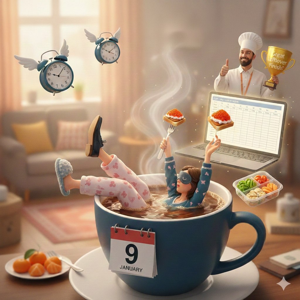 🛌🏃♂️☕️ Праздники еще не закончились, но они стремительно заканчиваются. Сегодня 9 января, и мы в странном лимбе: одной ногой в делах, а другой — всё еще в гостях у близких. ⏰🤯 Этапы плавного погружения 📉🧥🏠 Борьба систем. Мозг отчаянно пытается сопротивляться графику: организм искренне не понимает, почему утром нужно смотреть в списки дел, а не в тарелку с мандаринами. 🧠🧩 Тактика «медленных движений». Главный секрет этой пятницы: не делать резких движений, чтобы не спугнуть остатки праздника. Мы не бездельничаем — мы проводим инвентаризацию мыслей. 👀😴 📢 Сегодня отмечается неофициальный «День великого доедания». Миллионы людей по всей стране проводят ревизию холодильников, чтобы с честью завершить гастрономический марафон и наконец-то увидеть дно кастрюли. 🏆🚀 Но помните: во всем должна быть умеренность. Духовная рассудительность и спокойствие важнее любых излишеств, так что входим в рабочий ритм постепенно и с миром. 🧘♂️✨