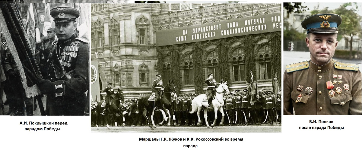 Покрышкина, как он и предполагал, вскоре вызвали в Москву, в штаб ВВС. Больше ему в городе на Эльбе было делать, по большому счету, нечего, зато в Москве готовились к важнейшему мероприятию – параду Победы на Красной площади. Знаменитого летчика и единственного в стране трижды Героя не могли не включить в состав сводного полка Первого Украинского фронта, он должен был нести штандарт фронта. Еще несколько летчиков из Второй воздушной армии были включены в состав сводного полка. Это были асы 5-го гвардейского Краснознаменного ордена Богдана Хмельницкого истребительного авиаполка - Георгий Баевский, Сергей Глинкин, Михаил Игнатьев, Александр Орлов, Виталий Попков, Александр Пчелкин и Евгений Ярёменко. Все они, разумеется, Герои Советского Союза, но правда, Орлов, Пчелкин и Ярёменко получат свои Золотые Звезды уже после парада - 27 июня 1945 года. Виталий Попков в этот же день получит вторую Золотую Звезду.