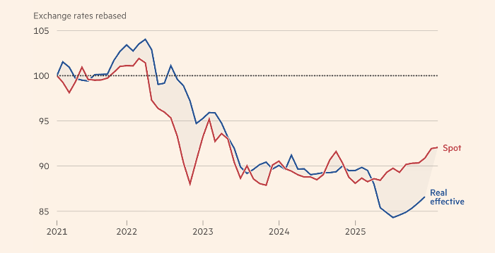 Когда Дональд Трамп объявил о новых пошлинах для Китая, многие опасались девальвации китайской валюты. Вопреки опасениям, в прошлом году юань вырос на 4,4% к доллару, но его реальный эффективный курс с учетом инфляции и валют торговых партнеров показывает иную картину. По этим показателям валюта продолжала обесцениваться с 2021 года большую часть 2025 года.