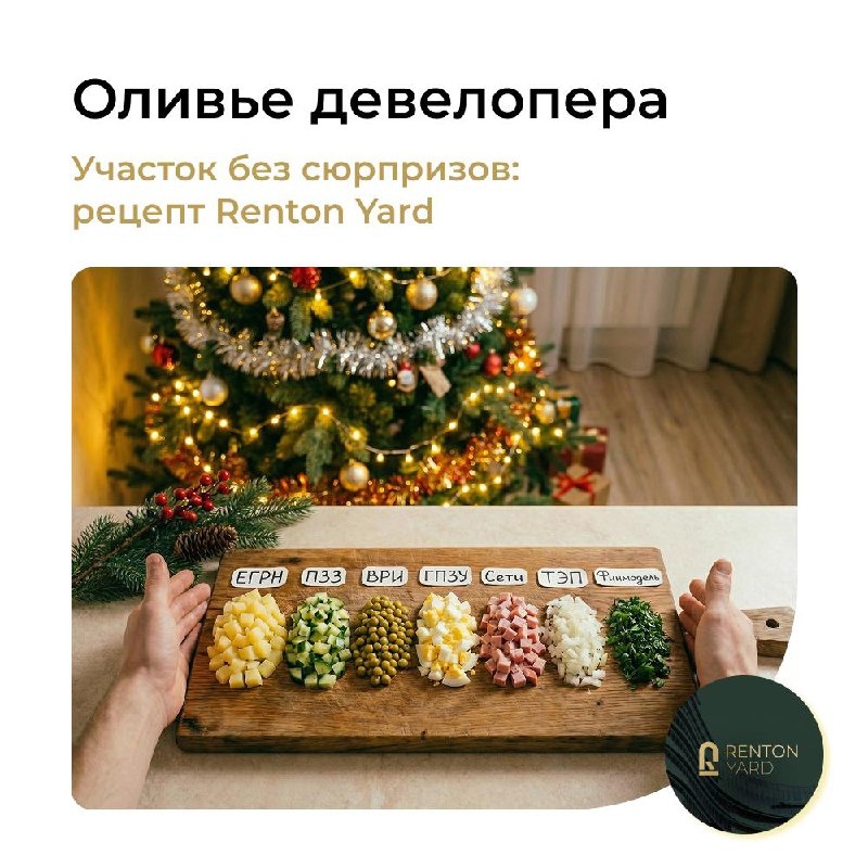🎄 Друзья, подготовили для вас настоящий фирменный рецепт новогоднего оливье девелопера — по рецепту Renton Yard. Оливье на праздники многие делают “на глаз”. С участками так не работает. Отсутствие хотя бы одного ингредиента сильно ухудшает вкус итогового проекта. Важно: каждый ингредиент добавляется в строго отмеренном виде. Вот правильная последовательность ингредиентов для выбора участка и запуска проекта. Добавляйте в салат именно в этом порядке — гарантируем, ваши вкусовые сосочки будут в восторге 🙂 1. ЕГРН + правоустанавливающие документы Кто владелец и что именно продают. 2. Кадастр и границы участка Площадь, контур, пересечения, красные линии.3. Ограничения и обременения Сервитуты, аренды, залоги, охранные зоны и прочие ограничения. 4. ПЗЗ и ВРИ Что на участке реально разрешено по правилам города.5. ГПЗУ (если уже есть или можно получить) Параметры и ограничения под будущий проект. 6. Сети и техприсоединение Мощности, точки, сроки, стоимость. Без пункта “потом решим”.7. Д