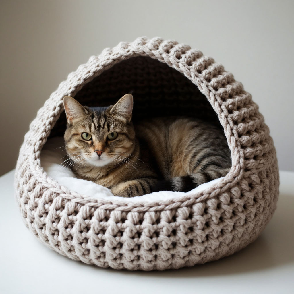 3. Плед-подушечка: Небольшой квадратный плед из толстой пряжи. Кошки обожают спать на вязаных текстурах.