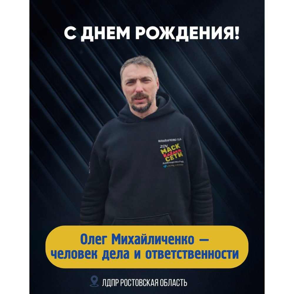 ! 🔝 Сегодня свой день рождения отмечает наш коллега Олег Михайличенко — человек, который много времени уделяет работе с людьми и реальной помощи там, где она действительно нужна. Олег активно участвует в волонтёрских и гуманитарных проектах, поддерживает участников СВО и их семьи, работает с жителями, откликается на обращения и старается решать конкретные вопросы на местах. Он регулярно участвует в общественных инициативах, помогает в организации гуманитарной помощи, поздравляет детей и поддерживает социальные проекты. ✨✨✨Ростовское региональное отделение ЛДПР поздравляет Олега Михайличенко с днём рождения и желает крепкого здоровья, сил и энергии, надёжных людей рядом, спокойствия в семье и уверенности в завтрашнем дне. Желаем, чтобы всегда находилось время для близких, чтобы планы реализовывались, а труд и усилия находили отклик и поддержку. Дорогие подписчики, благодарим Вас за поддержку! Ваши реакции, приглашения друзей и репосты позволяют нам развиваться. Не забывайте ставить