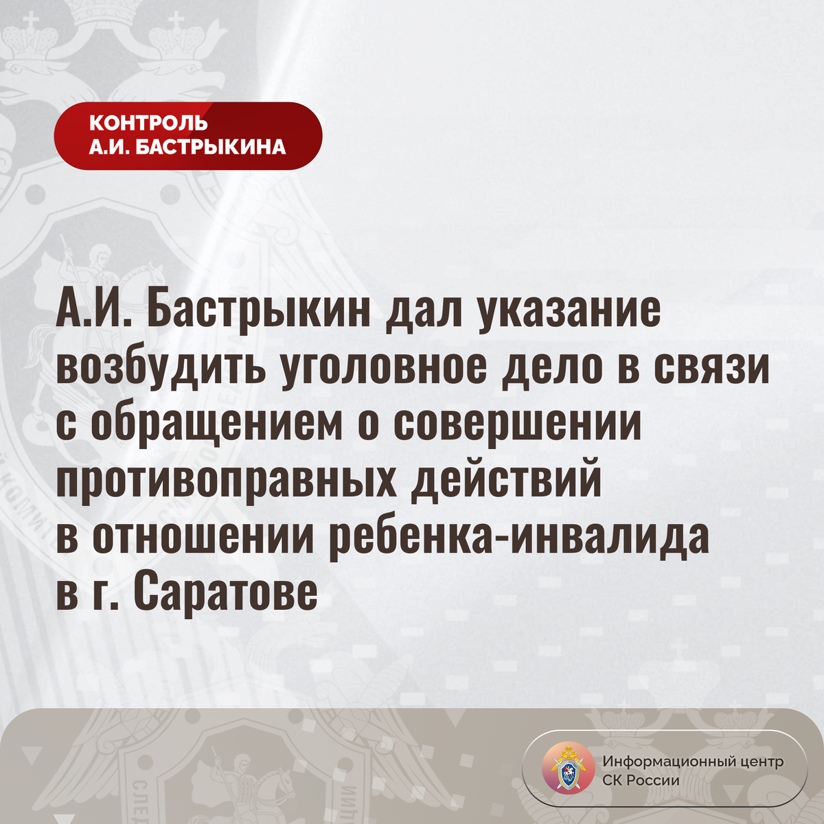 А.И. Бастрыкин дал указание возбудить уголовное дело в связи с обращением о совершении противоправных действий в отношении ребенка-инвалида в г. Саратове К Председателю СК России А.И. Бастрыкину через Информационный центр поступило обращение в интересах жительницы города Саратова по вопросу несогласия с результатами установления обстоятельств совершения противоправных действий в отношении ее 13-летней дочери, являющейся инвалидом. В апреле прошлого года в школе-интернате сверстник применил в отношении девочки физическую силу и совершил противоправные действия. Пострадавшей причинены телесные повреждения, ей требуется психологическая реабилитация. Отмечается, что аналогичные случаи происходили с другими детьми. Мер к нарушителю не принимается, коллективные жалобы родителей игнорируются. В СУ СК России по Саратовской области проводится процессуальная проверка. Председатель Следственного комитета Российской Федерации Александр Иванович Бастрыкин дал указание руководителю СУ СК России по